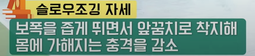 * 착지: 발뒤꿈치가 아닌 발의 앞부분이나 중간 부분으로 착지하는 것이 중요합니다. 발뒤꿈치는 가볍게 땅에 닿는 정도로 생각하면 됩니다.