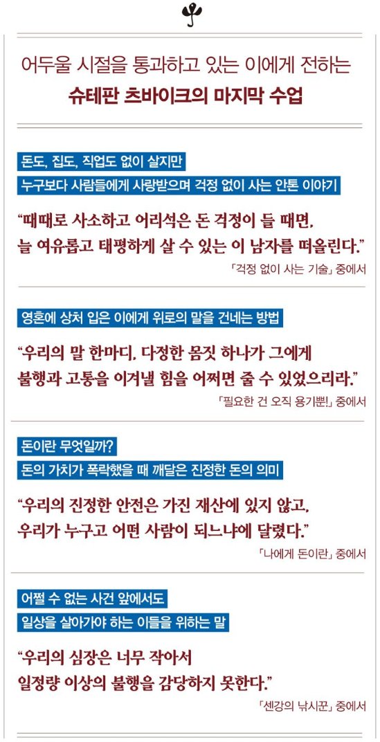우리는 각기 다른 이유로 힘들다. 하루하루를 무사히 보내는 것만으로도 벅차다. 이 책은 위대한 작가가 남긴 마지막 에세이이면서 인간이 인간에게 건네는 따뜻한 손길이다. 그리 길지 않은 책이지만 한 장, 한 장 그 책장에 담긴 온기를 느끼며 읽고 생각에 잠기기에는 충분하다. 만약 당신이 후회스러운 과거와 무력한 현재, 그리고 불안한 미래에 좌절했다면 슈테판 츠바이크의 이 에세이를 처방한다. 하늘에서 빛나고 있는 저 별들처럼 어두울 때에야 보이는 것들이 있다. 당신은 반드시 밝은 곳으로 나아갈 것이다.