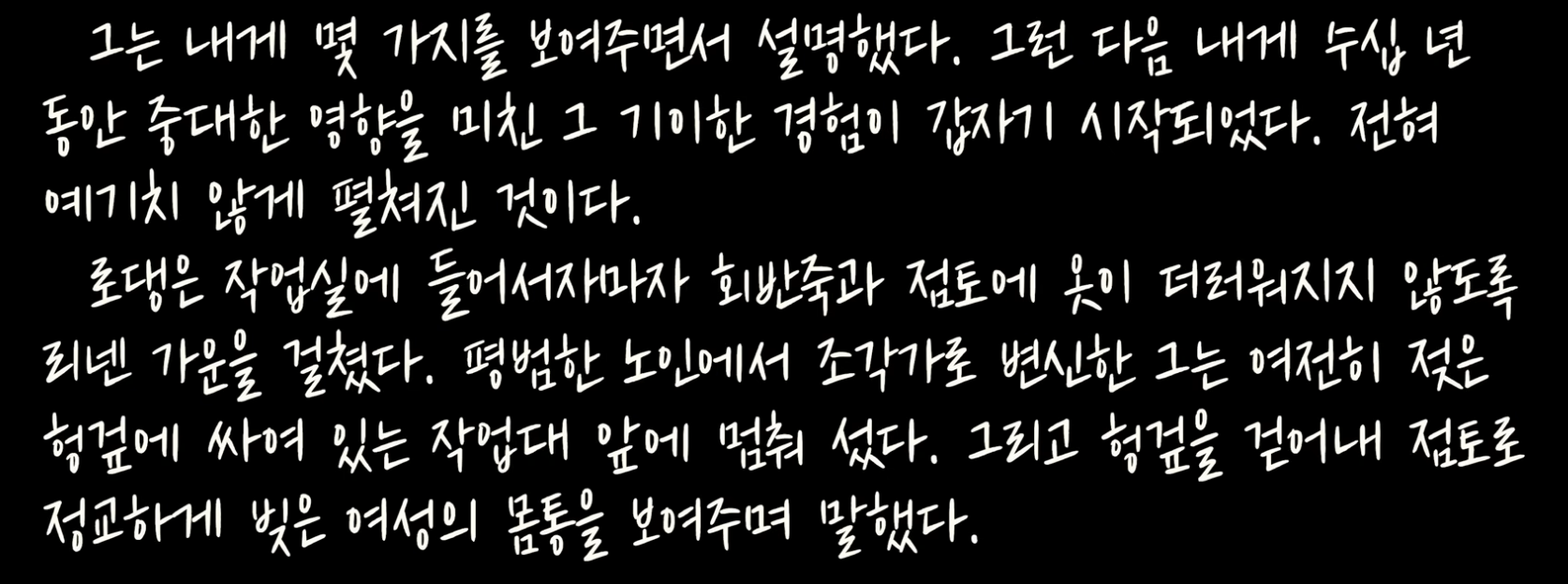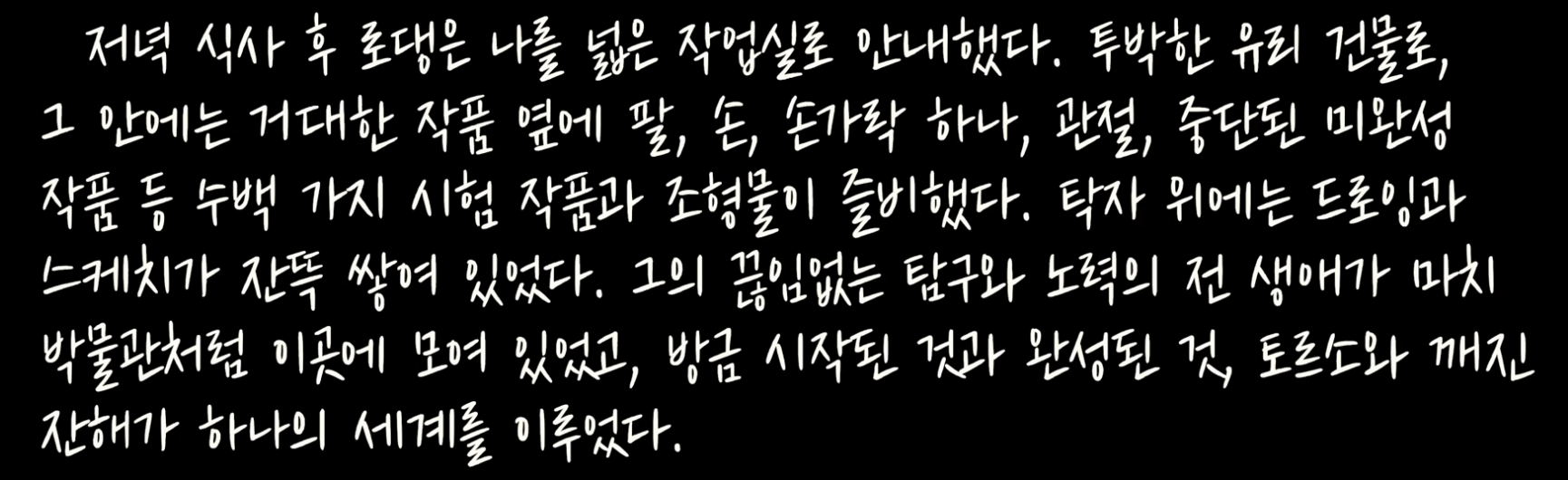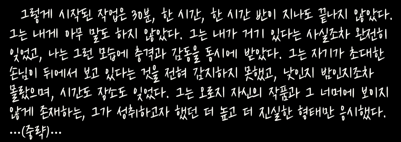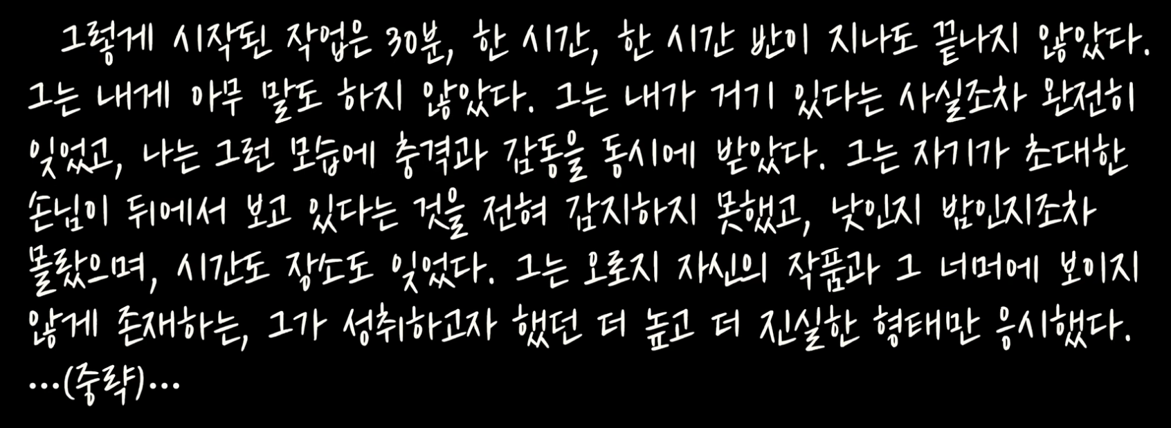 74쪽: 그렇게 시작된 작업은 30분, 한 시간, 한 시간 반이 지나도 끝나지 않았다. 그는 내게 아무 말도 하지 않았다. 그는 내가 거기 있다는 사실조차 완전히 잊었고, 나는 그런 모습에 충격과 감동을 동시에 받았다. 그는 자기가 초대한 손님이 뒤에서 보고 있다는 것을 전혀 감지하지 못했고, 낮인지 밤인지조차 몰랐으며, 시간도 장소도 잊었다. 그는 오로지 자신의 작품과 그 너머에 보이지 않게 존재하는, 그가 성취하고자 했던 더 높고 더 진실한 형태만 응시했다.
