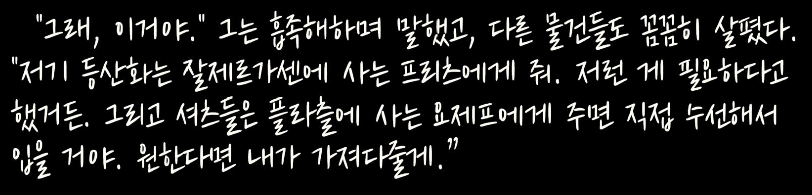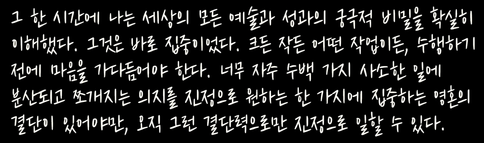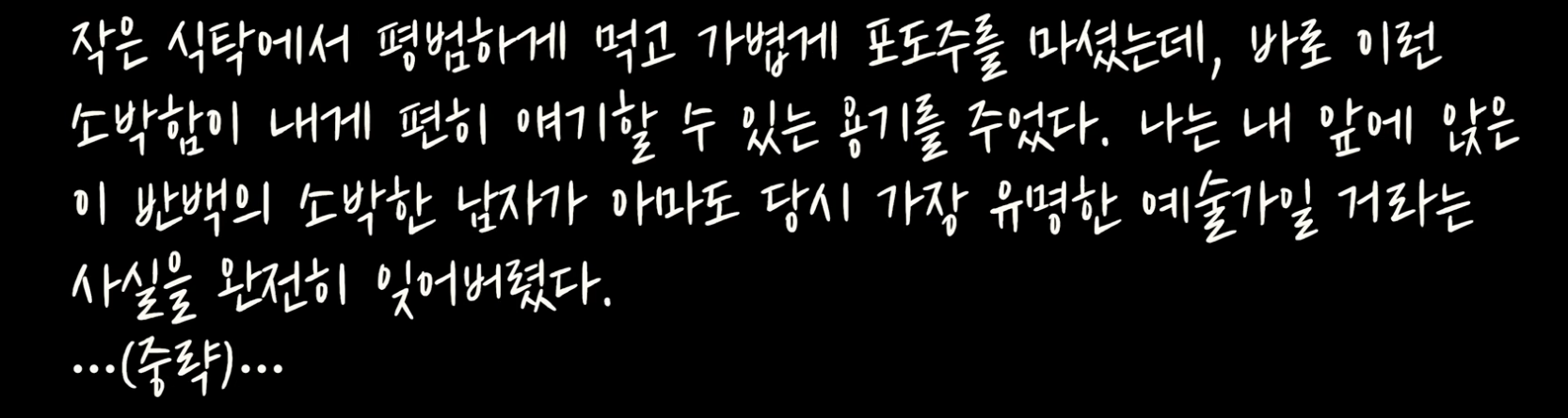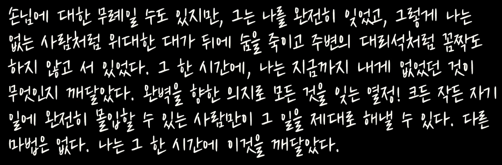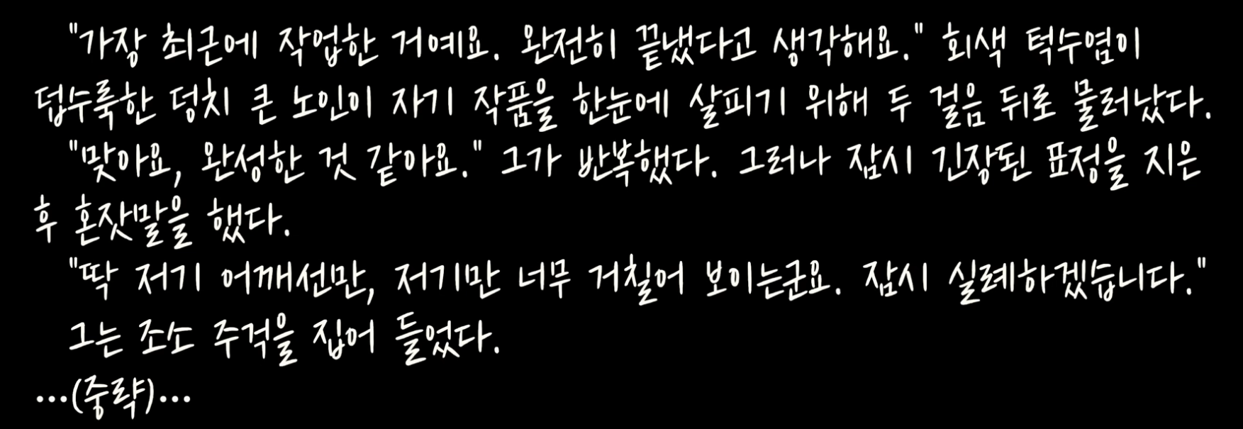 74쪽: 그렇게 시작된 작업은 30분, 한 시간, 한 시간 반이 지나도 끝나지 않았다. 그는 내게 아무 말도 하지 않았다. 그는 내가 거기 있다는 사실조차 완전히 잊었고, 나는 그런 모습에 충격과 감동을 동시에 받았다. 그는 자기가 초대한 손님이 뒤에서 보고 있다는 것을 전혀 감지하지 못했고, 낮인지 밤인지조차 몰랐으며, 시간도 장소도 잊었다. 그는 오로지 자신의 작품과 그 너머에 보이지 않게 존재하는, 그가 성취하고자 했던 더 높고 더 진실한 형태만 응시했다.