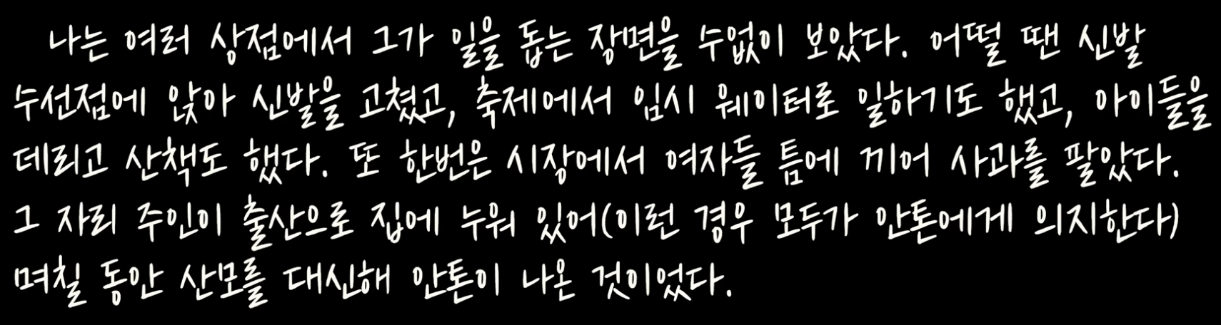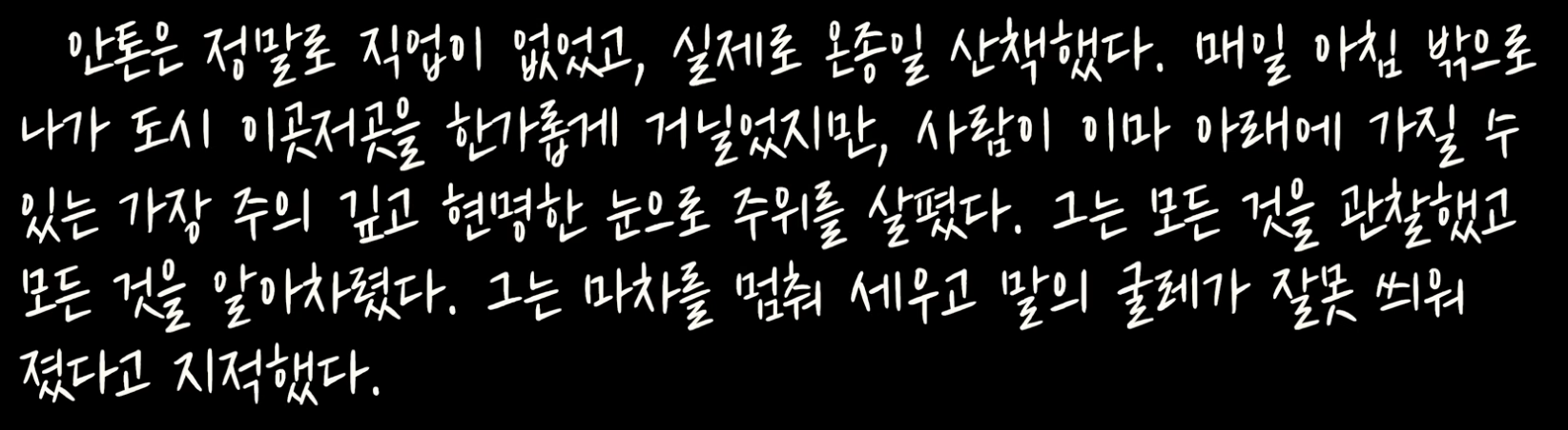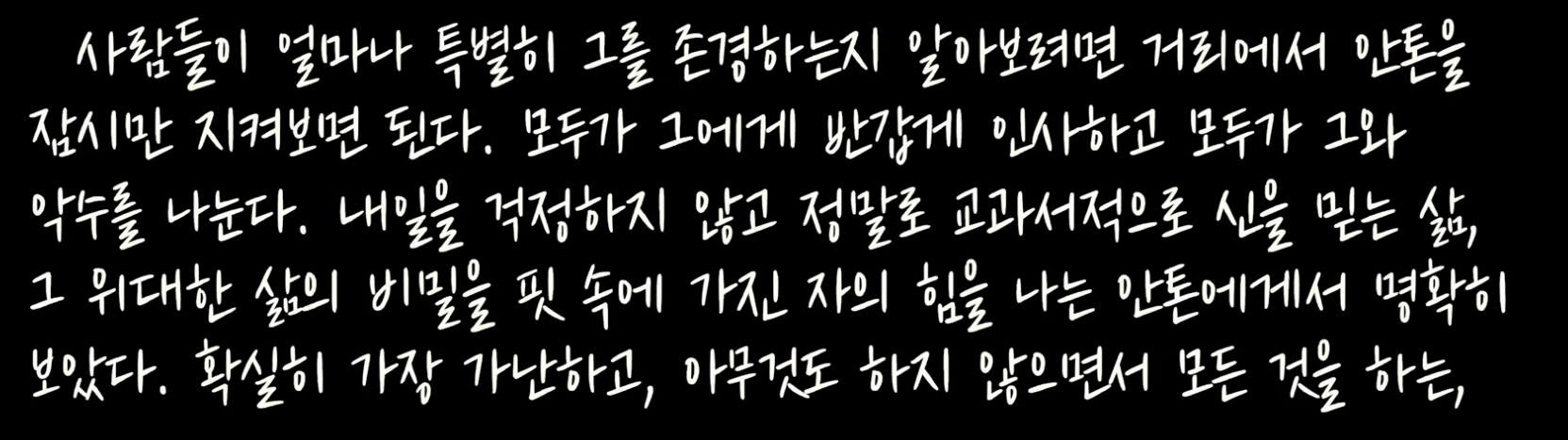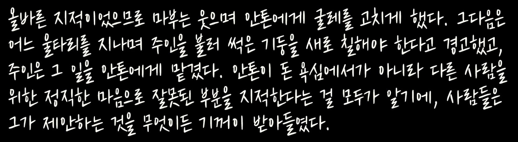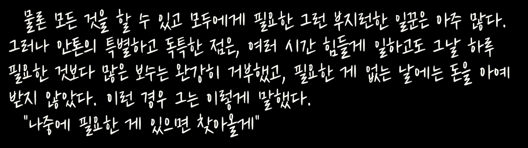나는 종종 안톤을 생각한다. 그토록 큰 도움을 내게 준 사람은 거의 없었기에 항상 고마운 마음이 든다. 때때로 사소하고 어리석은 돈 걱정이 들 때면, 나는 당장 단 하루에 필요한 것 이상을 원하지 않아 늘 여유롭고 태평하게 살 수 있는 이 남자를 떠올린다. 허름한 옷차림의 그를 여러 차례 보았다. 그는 늘 한결같이 쾌활하고 태평했다. 그럴 때마다 나는 생각했다. 모든 사람이 이런 상호 신뢰의 비결을 배운다면, 경찰도 법원도 교도소도 돈도 필요 없을 거라고.