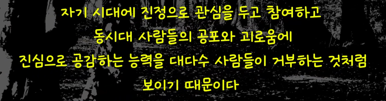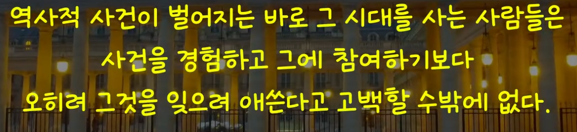 54쪽: 솔직하게 자문해 본다면, 우리 중 누구도 이렇게 끊임없이 닥치는 높은 긴장에 대처할 여력이 없고, 우리는 그저 이따금 좌절과 절망의 눈으로 사건을 바라볼 뿐임을 깨닫게 될 것이다. 이 새댜의 대다수는 역사가 아니라 언제나 오직 자신의 삶을 산다...... 평범하지 않은 사건들이 사방에서 벌어지더라도 일상생활은 평범하게 계속 이어진다.