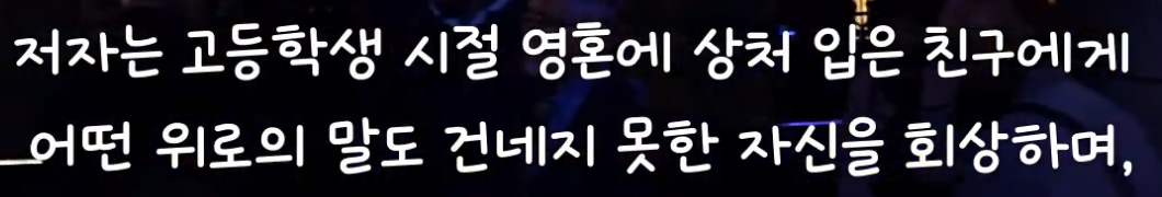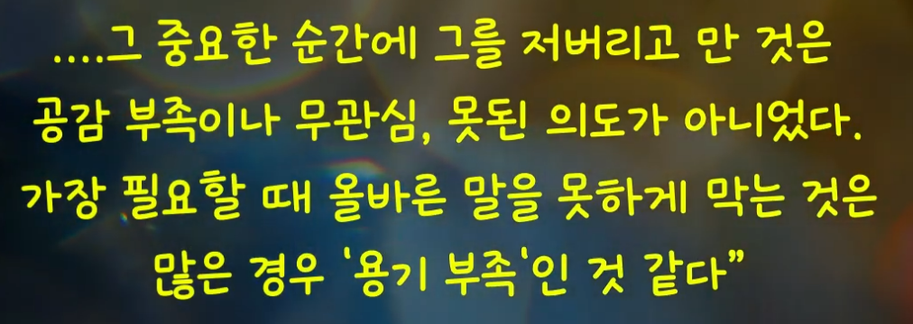 32쪽: 그가 계속 학교에 다닐 수 있었다면 그는 분명 우리 모두보다 훨씬 나은 삶을 살았을 것이다. 하지만 그를 돕지 못한 우리의 주저가 그의 인생 경로 변경에 의심의 여지없이 결정적 역할을 했다. 그날 아침 우리의 말 한마디, 다정한 몸짓 하나가 그에게 불행과 고통을 이겨낼 힘을 어쩌면 줄 수 있었으리라. 그 중요한 순간에 그를 저버리고 만 것은 공간 부족이나 무관심, 못된 의도가 아니었다. 가장 필요할 때 올바른 말을 못하게 막는 것은 많은 경우 용기부족인 것이다.