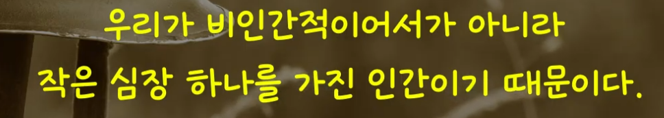 60쪽: 조용하고 사적이며 눈에 띄지 않는 일상생활에 집중하는 것은 결국 더 강한 자연의 의지에 순종하는 것이다. 자연의 의지는 연속성이기 때문이다. 자연은 어떤 중단도 용납하지 않는다. 자연은 사람들 일부가 무참히 파괴되더라도, 나머지 사람들은 끈기있게 인내하며 일상생활을 이어나가길 요구한다. .... 무너져 가는 세계의 폐허를 계속 노려보는 대신 더 나은 세계를 건설하려고 노력할 때 비로소 우리는 거부할 수 없는 자연의 명령에 순종하게 된다.