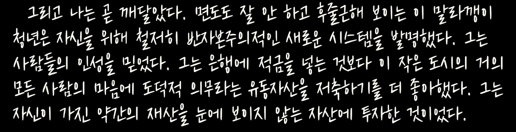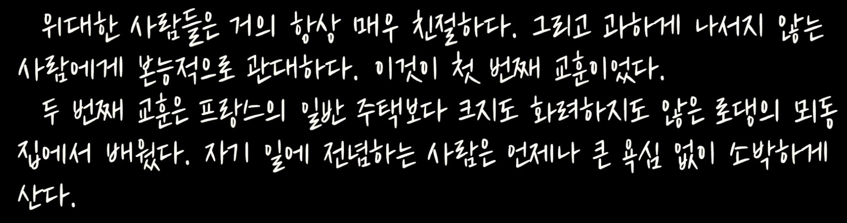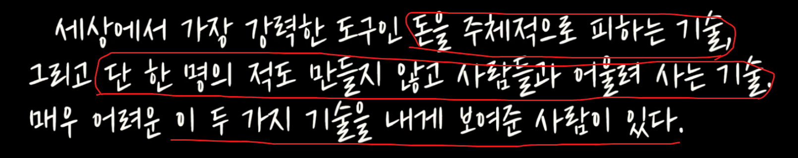 44쪽: 나는 돈의 주인이 아니고, 돈이 내 삶의 지배자가 되는 것도 원치 않는다. 그날의 경험을 통해 나는 지울 수 없는 교훈을 배웠다. 우리의 진정한 안전은 가진 재산에 있지 않고, 우리가 누구고 어떤 사람이 되느냐에 달렸다.