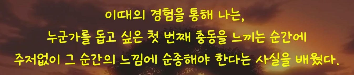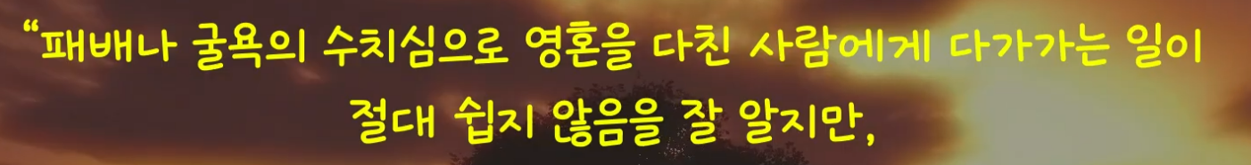 패배나 굴욕의 수치심으로 영혼을 다친 사람에게 다가가는 일이 절대 쉽지 않음을 잘 알지만, 이때의 경험을 통해 나는 누군가를 돕고 싶은 첫 번째 충동에 주저 없이 순종해야 한다는 것을 배웠다.