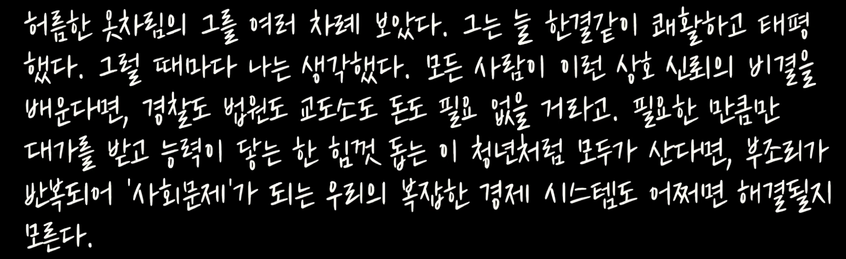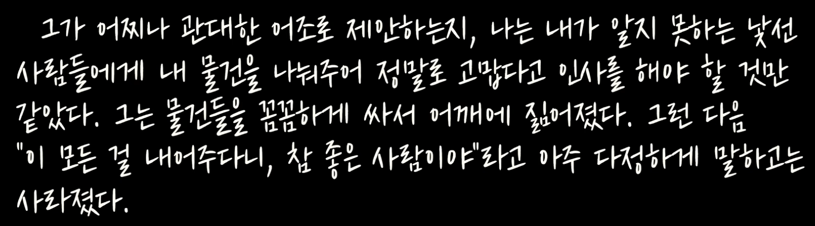 32쪽: 우리는 모두 죄책감을 느꼈고, 상황을 바로잡을 방법을 궁리하기 시작했다. 하지만 너무 늦었다. 그는 우리에게 기회를 주지 않았다. 다음 날 아침 그의 자리는 다시 비었다.