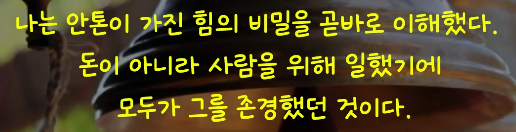 저자는 세상에서 가장 강력한 도구는 돈을 주체적으로 피하는 기술과 단 한명의 적도 만들지 않고 사람들과 어울려 사는 기술이라고 주장한다. 이러한 역할을 동네 이곳저곳을 한가롭게 거닐며 산책하는 안톤이 실천하고 있다. 안톤이 돈이 아니라 사람을 위해 일했기에 가능했으며 마을 주민들은 모두 그를 존경했다. 안톤은 직업도 없고 아무런 고정 수입이 없었으며 집도 없었다. 그는 자는 곳이 매일 달랐고, 그날그날 먹고사는 사람이었다. 사람들은 그가 보수를 요구해서가 아니라 진정 그 사람을 돕고 싶어 한다는 사실을 알았기에 언제나 그의 도움을 감사히 받았고 그가 원하는 최소한의 사례를 했다. 그는 아무것도 가지지 못했지만 모든 것을 가졌다.