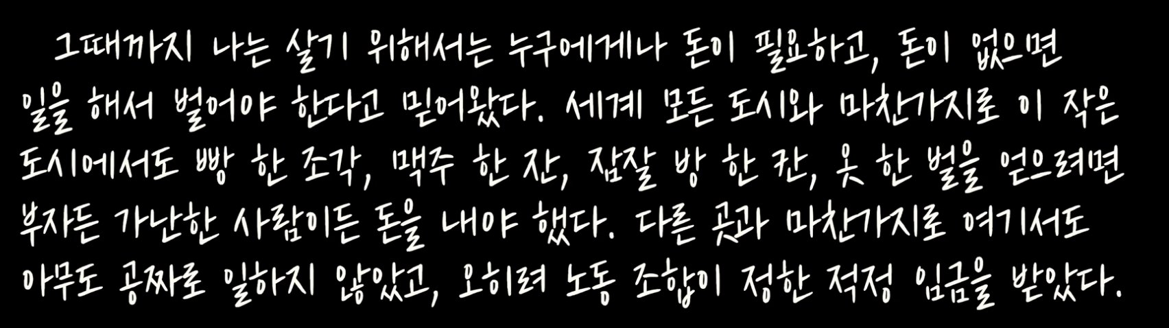 42쪽: 우리는 비록 돈에 실패했지만, 삶의 용기와 기쁨을 잃지는 않았다. 오히려 돈의 가치가 떨어질수록 삶의 가치(일, 사랑, 우정, 예술, 자연 등)가 더욱 중요해졌다. 젊은이들은 산으로 하이킹을 갔다가 햇볕에 그을린 행복한 얼굴로 돌아왔고, 댄스 홀은 발 디딜 틈 없이 꽉 찼고, 새로운 기업과 공장과 집이 빠르게 늘어났다. .... 돈을 믿지 못하게 되면서 사람들은 여전히 신뢰할 수 있는 것들의 진수를 깨달았다. 그리고 그것의 가치를 보존하고 수호하기 위해 더욱 노력했다.