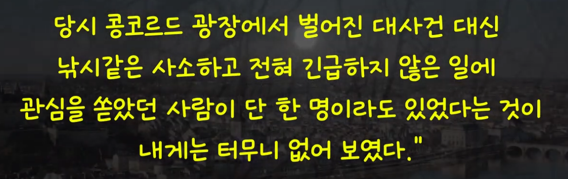 51쪽: 파란만장한 4년이 지나고 마침내 루이 16세가 처형되는 극적인 날이 왔다......역사적으로 잊을 수 없는 이 순간에 콩코르드광장과 단두대에서 엎어지면 코 닿을 곳에 있는 센강에서 수많은 낚시꾼이 여느 때와 마찬가지로 낚시를 하고 있었다.