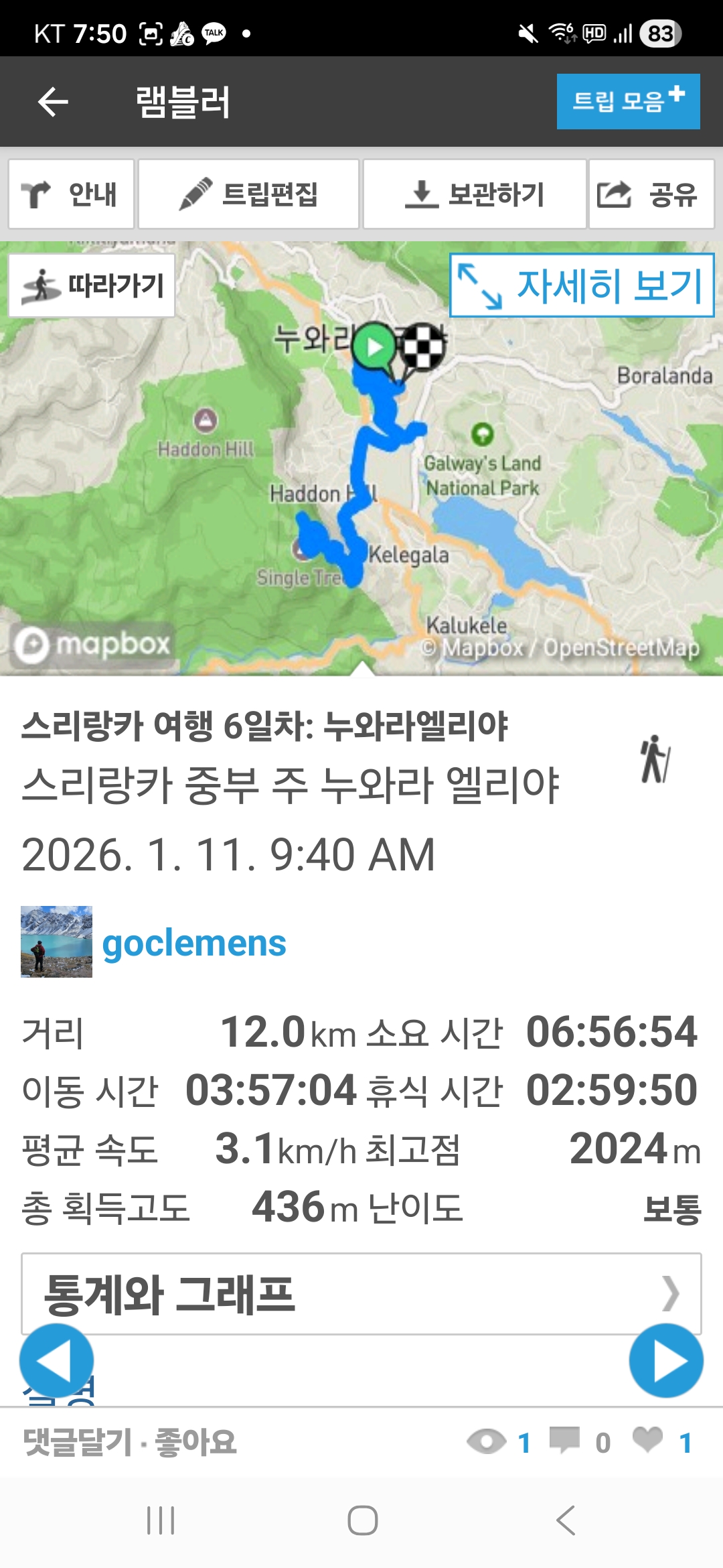 총 12km, 이동시간 4시간, 휴식 3시간을 기록하였다.