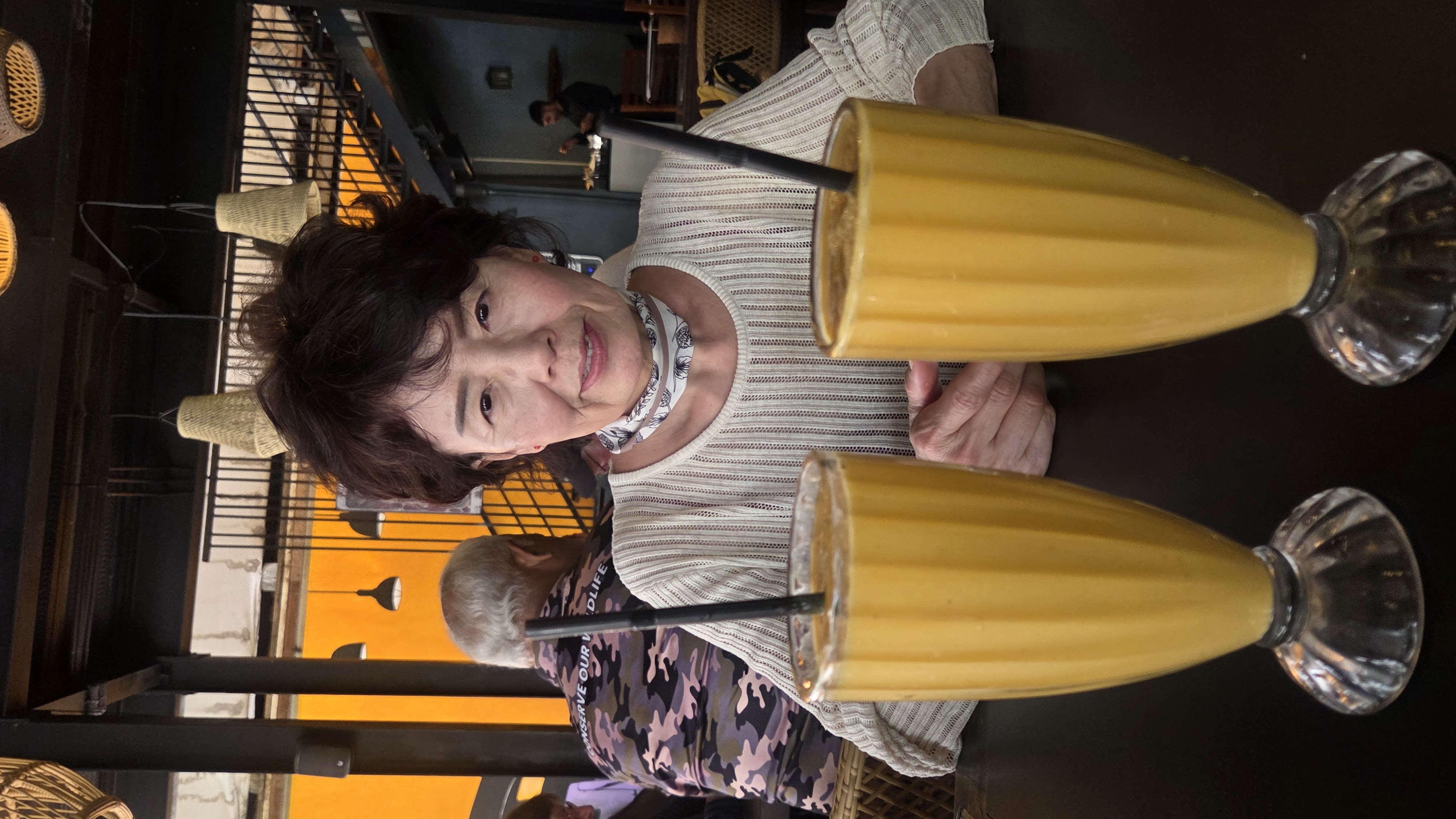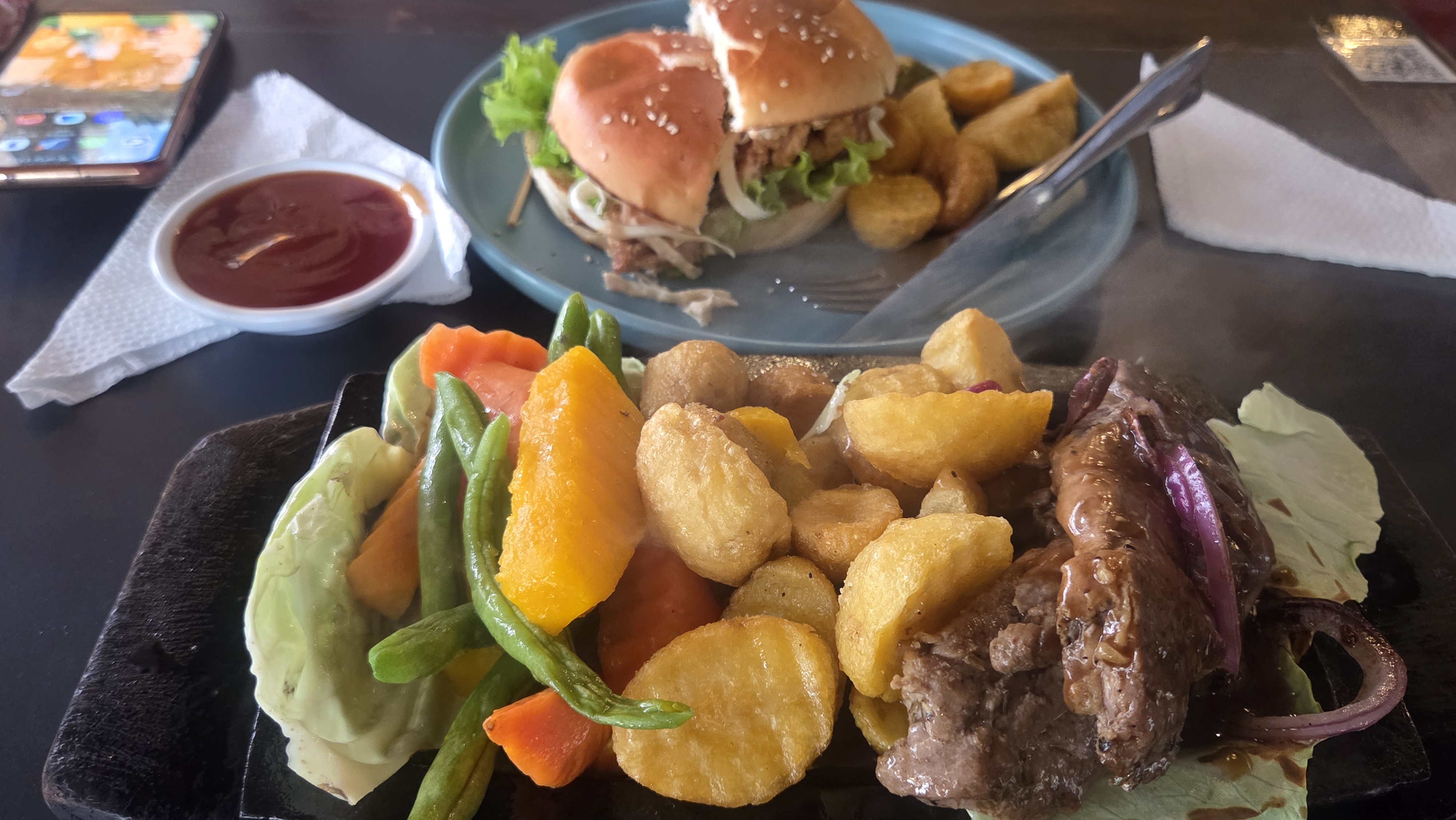 점심 식사로 비프 스테이크와 햄버거를 주문하였다. 음료는 망고 스무디로~