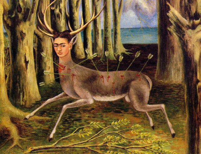 그녀의 얼굴을 한 사슴이 온몸에 화살을 맞은 채로 주저앉아 있지. 언제 또 날카로운 화살이 날아올지 모르는데 이곳에서 빠져나갈 구멍도 마땅히 없어 보여. 사방은 빽빽한 나무들로 둘러싸였고 뒤로는 폭풍우가 바람에 몰아치고 있으니 말이야. 그런데 이런 외롭고 위험한 상황에서도 그녀의 표정은 어쩐지 무심한 듯 의연해 보이지 않니? 형형한 눈빛에서 어떤 고통이 오든 기꺼이 버텨내겠다는 강인한 의지가 비치는 것 같아.