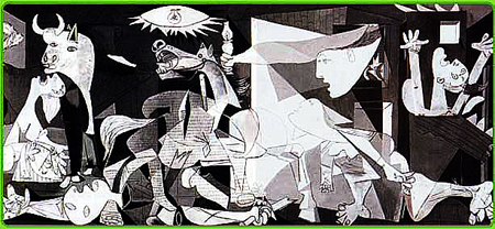 제2차 세계대전을 코앞에 둔 1937년 4월 26일, 나치 독일군 폭격기들이 스페인의 조그만 마을 게르니카의 하늘을 뒤덮었어. 전쟁을 준비하던 나치가 자신들의 최신 무기와 전술을 시험하겠다고 이 마을을 무자비한 실험장으로 삼았거든. 무려 25 대의 폭격기가 3시간이 넘게 50톤에 달하는 폭탄을 쉬지 않고 쏟아부었지. 평화로웠던 게르니카는 이 폭격으로 끔찍하게 박살이 났어. 마을 전체가 불길에 휩싸였고 마을사람 3명 중 1명이 목숨을 잃었지. 그리고 이 잔혹한 학살에 누구보다도 분노했던 한 화가가 있었단다. 바로 스페인이 낳은 위대한 화가 파블로 피카소였지................ 건물 삼층 높이에 해당하는 한 눈에 담기 조차 버거운 어마어마한 크기의 이 그림에서 가장 먼저 눈에 띄는 건 색깔이야. 피카소는 오직 흑색, 회색, 흰색의 무채색만을 사용했어. 그래서인지 마치 그 날의 참상을 전한 흑백 신문처럼 보이기도 하지. 일그러지고, 뒤틀리고, 온통 으스러진 형상으로 가득 찬 이 초대형 그림 속으로 한 걸음 더 들어가면 더욱 가슴 아픈 모습들을 만날 수 있어.