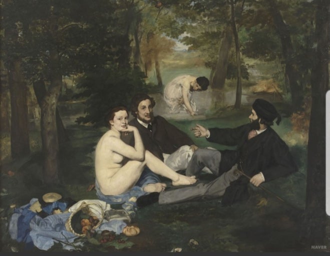 깊은 숲속 풀밭에서 식사를 즐기는 두 남자와 벌거벗은 채로 화면 밖을 응시하는 한 여자가 앉아 있어. 당시 부르조아 남성들은 이렇게 매춘 여성과 풀밭으로 나들이 가는 것을 즐겼대. 마네는 바로 그 장면을 포착한 거야. 아무도 다루지 않은 현실인 만큼 자신에게 쏟아질 화단의 박수갈채를 기대하며 그림을 그려나갔지. 하지만 예상은 단단히 빗나가고 이 작품은 살롱전 심사에서부터 단칼에 거절당하고 말거든. ... 여자의 뱃살이 볼록 나온게 너무 현실적이고 평범해 보여서 당시 사람들이 아름답다고 생각하는 이상적인 여성의 모습과는 거리가 멀었거든.